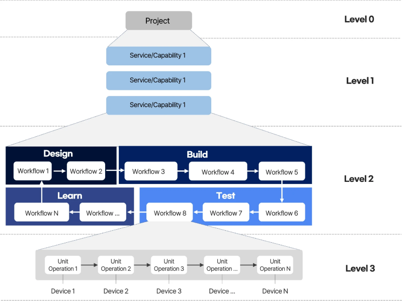 Abstraction hierarchy of biofoundry operations across four levels: project (lvl 0), service/capability (lvl 1), workflow (lvl 2) and unit operation (lvl 3). Source: Nature Communications